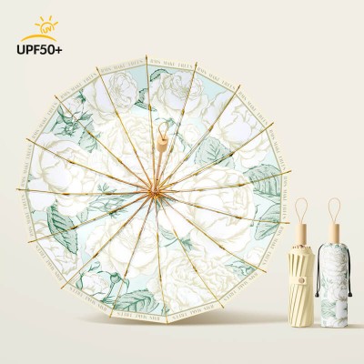 Ô dù cầm tay cao cấp gập 3, 16 xương, họa tiết, tay cầm gỗ, gấp thủ công, chuyên che nắng nắng và mưa, ô dù gấp gọn chống tia cực tím UPF 50+