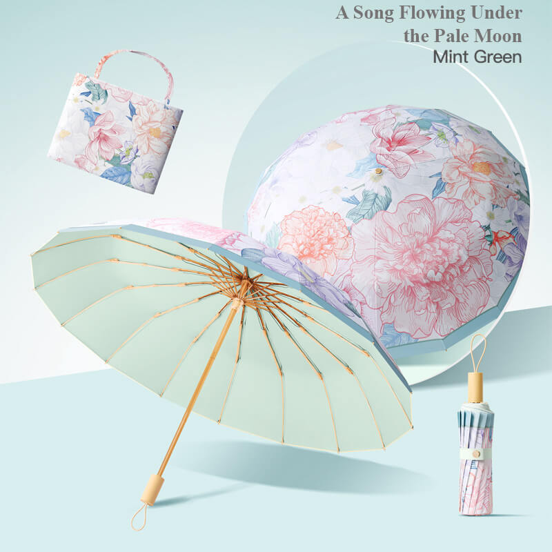 Chiếc ô dù cầm tay cao cấp 16 xương gập 3 tay cầm gỗ – A Song Flowing Under the Pale Moon (Mint Green) là biểu tượng của sự tinh tế, nhẹ nhàng và thanh lịch. Lấy cảm hứng từ khung cảnh trăng mờ và khúc nhạc hoa đêm, chiếc ô được trang trí với họa tiết hoa mẫu đơn và lan mềm mại trên nền màu xanh mint nhạt mát mắt, mang đến cảm giác thơ mộng và thanh thoát.