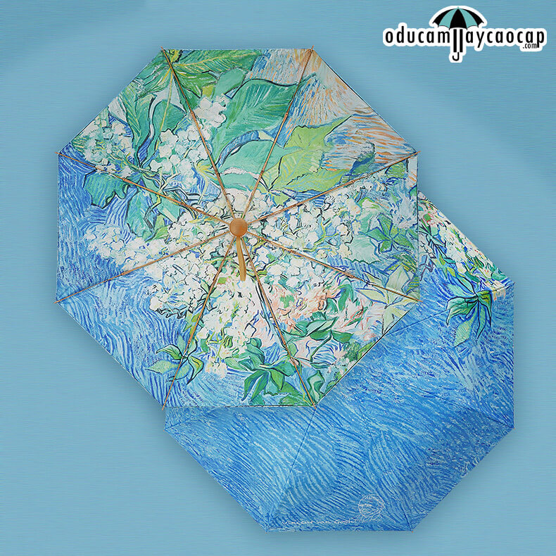Ô dù cầm tay cao cấp VONLILIENFELD mang họa tiết "Cành hạt dẻ nở rộ" nổi tiếng của Van Gogh là lựa chọn lý tưởng dành cho những ai yêu nghệ thuật và phong cách thanh lịch. Họa tiết được in 2 mặt sắc nét, tái hiện sống động những chùm hoa hạt dẻ trắng hòa cùng nền xanh đặc trưng trong tranh gốc, tạo nên vẻ đẹp tươi sáng, tinh tế và đậm chất nghệ thuật Hậu Ấn Tượng. Thiết kế độc đáo giúp chiếc ô không chỉ là vật dụng che nắng che mưa mà còn là phụ kiện thời trang nổi bật dành cho phái nữ.