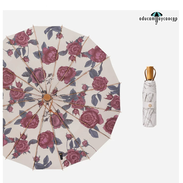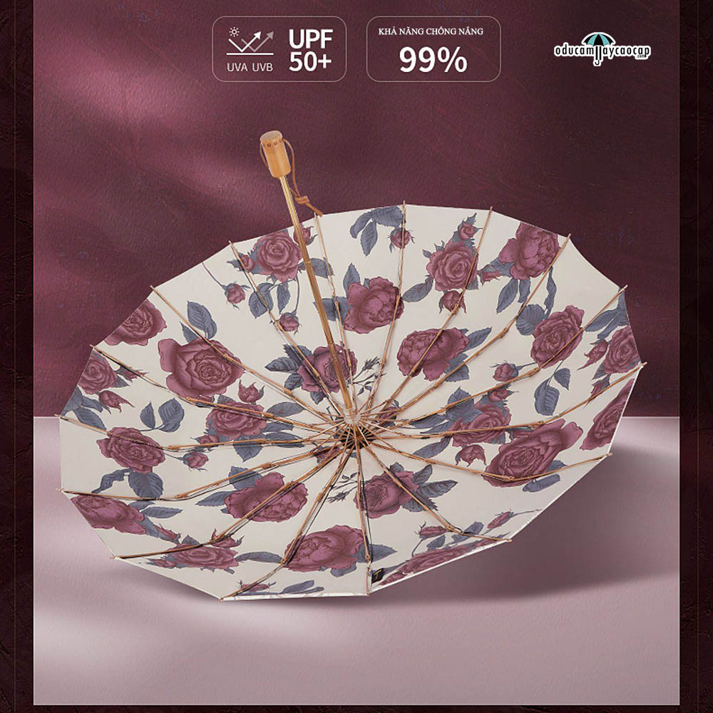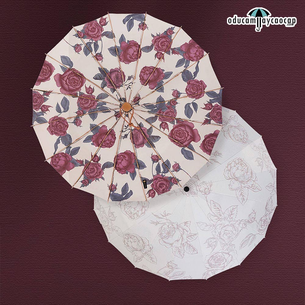 Garden Rose - [16 XƯƠNG - 102CM - Ô DÙ GẬP 3 - 2 LỚP KÉP] - Ô dù cầm tay cao cấp gập 3 ,16 xương tay cầm gỗ, 2 tán kép họa tiết, chống UV